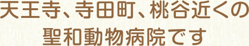 動物病院は、JR寺田町駅のすぐ近くにあります。JR環状線の天王寺駅・桃谷駅からも交通の便が良く、ご来院いただいております。大阪市天王寺区、中央区、阿倍野区、生野区の動物病院をお探しの方は、聖和動物病院へ。